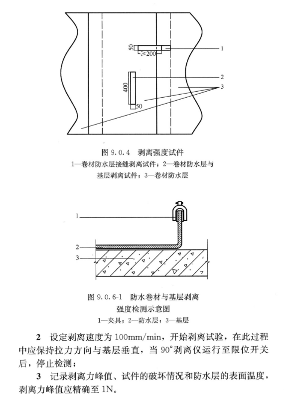 2、卷材防水層與基層剝離強度試件:采用切割工具沿縱向在卷材防水層上切割出長度為(400±10)mm,寬度為(50±5)mm的試件,并將試件的一端拉起30mm